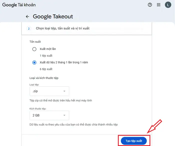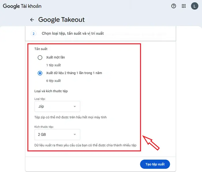 *Mẹo nhỏ: Bạn nên chọn mức 10GB hoặc 50GB nếu dữ liệu lớn. Điều này giúp tránh việc Google chia nhỏ dữ liệu thành hàng chục file 2GB, khiến việc tải về vô cùng mệt mỏi.