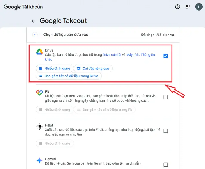 - Tùy chỉnh định dạng: Ở một số mục như Google Drive, bạn có thể nhấn vào nút Tất cả dữ liệu Drive đi kèm để chọn cụ thể từng thư mục thay vì tải toàn bộ.