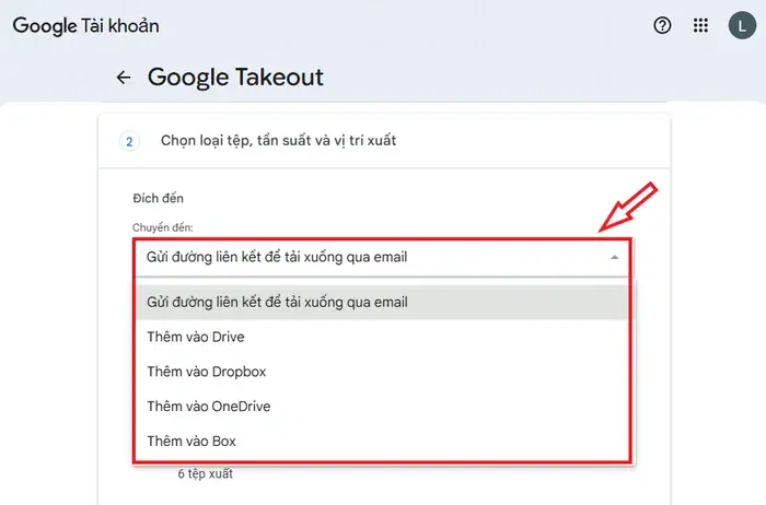 - Nhiều lựa chọn lưu trữ: Bạn có thể tải trực tiếp về máy tính hoặc yêu cầu Google chuyển thẳng tệp nén sang các dịch vụ đám mây khác như Dropbox, OneDrive, Box hoặc chính Google Drive.