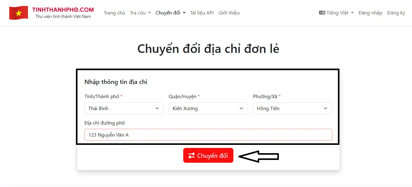 - Bước 3: Nhập địa chỉ cũ cần tra cứu vào ô tìm kiếm bao gồm Tỉnh/Thành phố, Quận/Huyện, Phường/Xã và Địa chỉ đường phố > Sau đó click chọn vào nút Chuyển đổi.