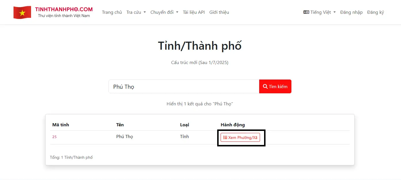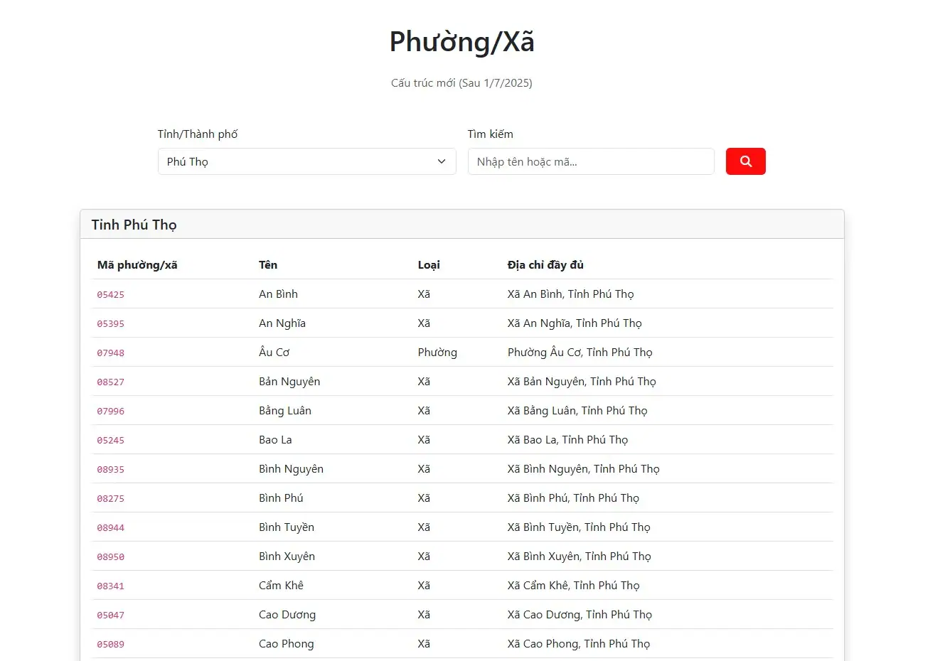 - Bước 5: Danh sách Xã/Phường sẽ hiển thị kèm với Mã, Tên, Loại và Địa chỉ đầy đủ.