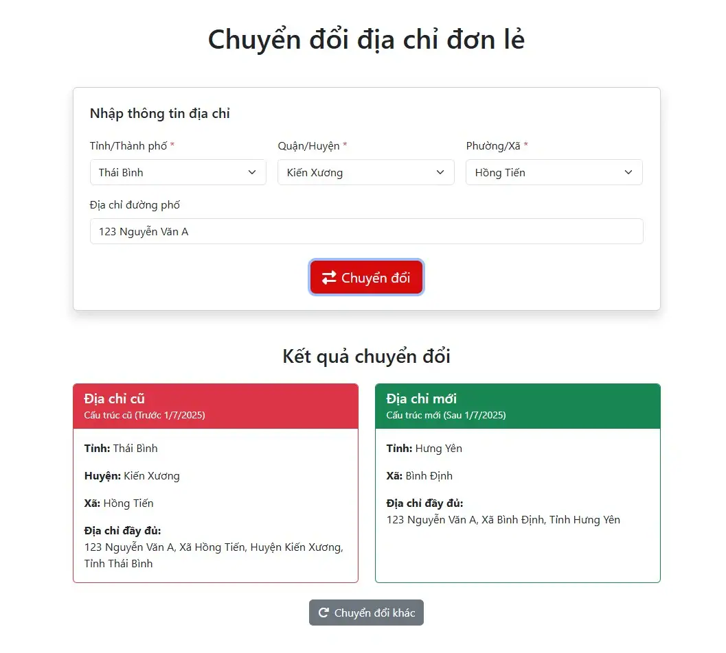 - Chuyển đổi đơn lẻ: Người dùng nhập địa chỉ cụ thể, hệ thống trả về kết quả địa chỉ sau khi sáp nhập.