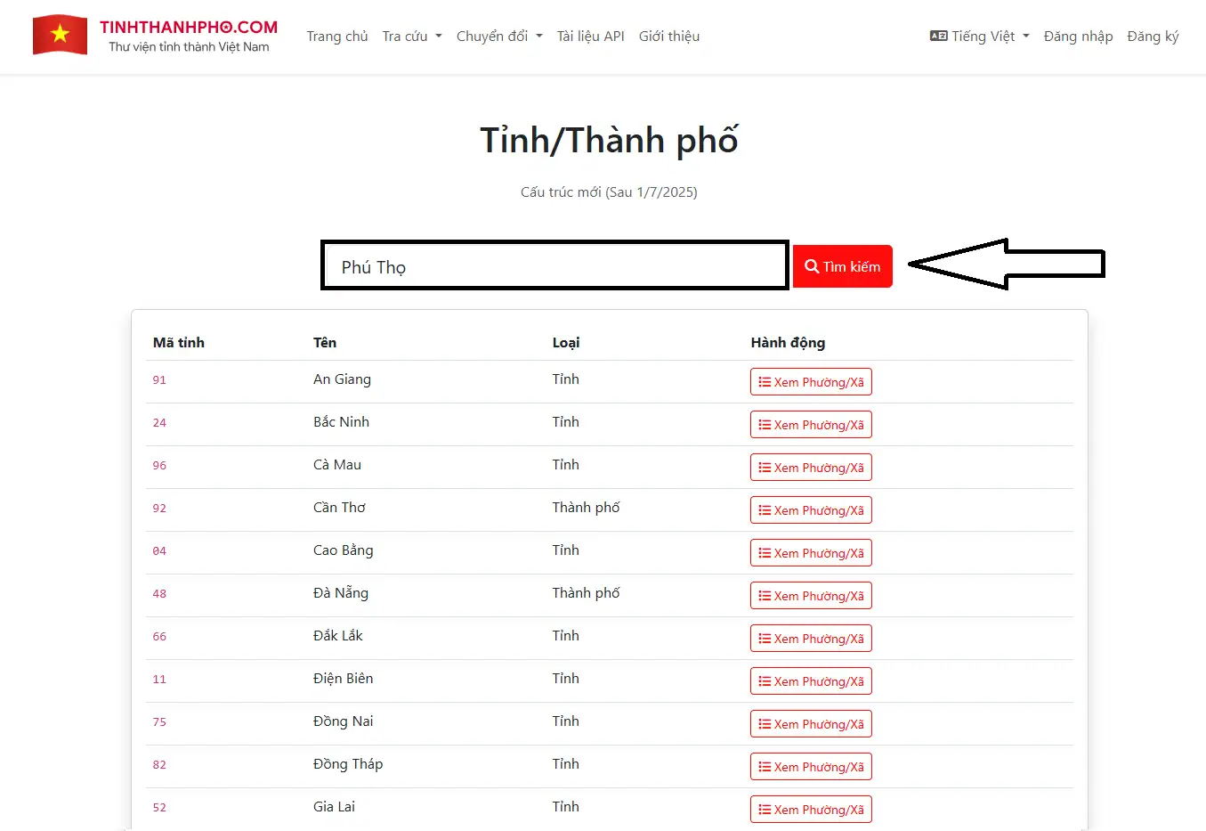 - Bước 3: Ví dụ tôi lựa chọn Tỉnh/Thành phố theo Cấu trúc mới. Lúc này một giao diện mới sẽ hiển thị ra, tại đây có danh sách 34 Tỉnh/Thành phố mới sau khi sáp nhập bạn có thể tìm kiếm thủ công theo tên. Ngoài ra, bạn có thể nhập tên tỉnh vào ô trống và click chọn Tìm kiếm.