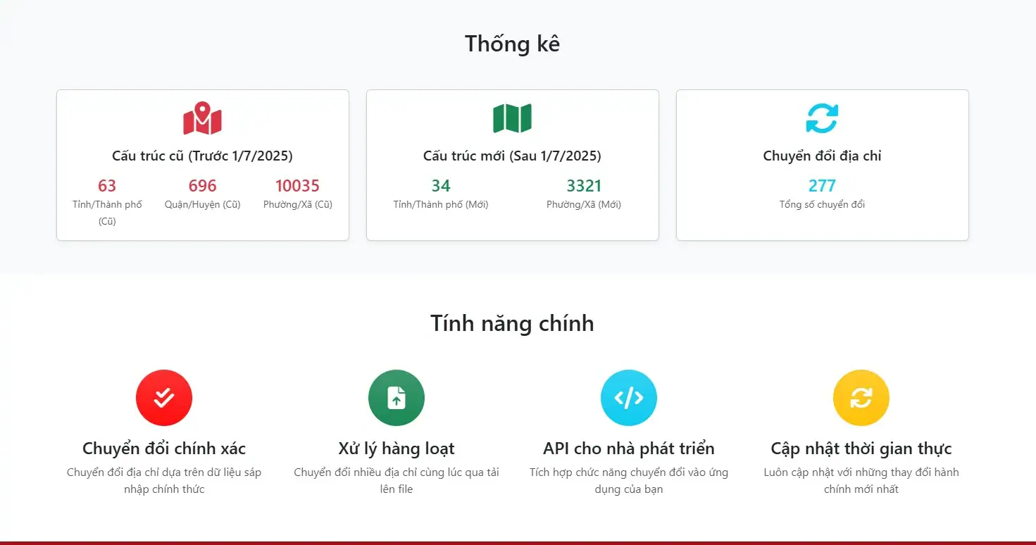 Website này là nền tảng hỗ trợ chuyển đổi địa chỉ cũ sang địa chỉ mới bao gồm các đơn vị hành chính Việt Nam trước và sau ngày 1/7/2025, thời điểm áp dụng quy định mới về sáp nhập cấp huyện, cấp xã trên toàn quốc. Trang web được phát triển bởi HVN Goup, cung cấp công cụ tra cứu địa chỉ hành chính theo thời điểm, công cụ chuyển đổi địa chỉ cũ sang địa chỉ mới (hỗ trợ cả chuyển đổi hàng loạt), cùng với hệ thống API mạnh mẽ phục vụ các nhà phát triển và doanh nghiệp.