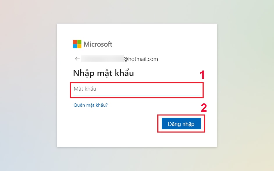 – Bước 3: Tiếp đến, người dùng chỉ cần nhập mật khẩu tài khoản Hotmail Outlook vào ô trống và click chọn Đăng nhập.