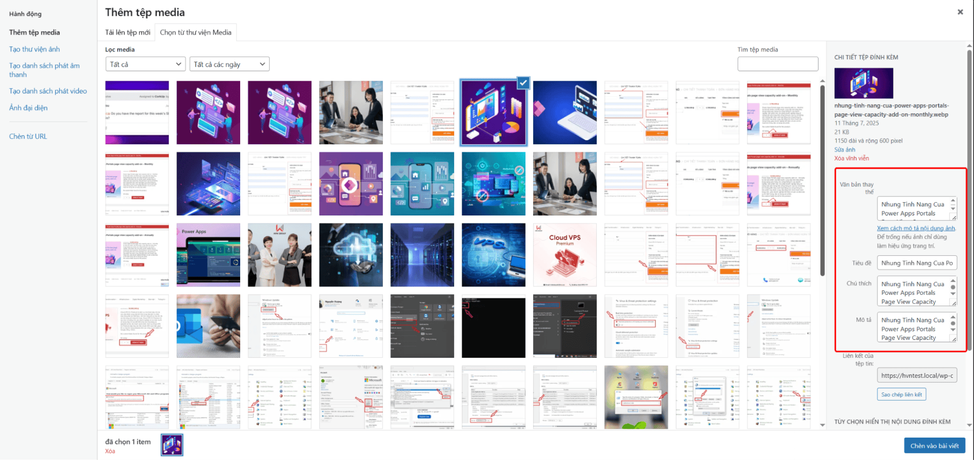 Ở phần bên phải của giao diện chèn hình, hãy nhập đầy đủ thông tin cho các thẻ như Văn bản thay thế (Alt Text), Chú thích (Caption), Mô tả (Description).