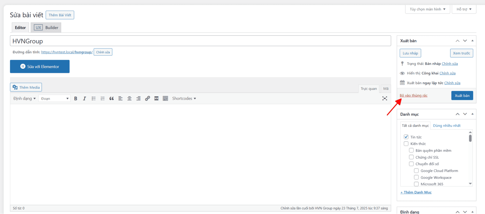 - Một loạt tùy chọn sẽ hiện ra bên dưới tiêu đề nhấn vào “Thùng rác” (Trash) để đưa bài viết vào thùng rác.