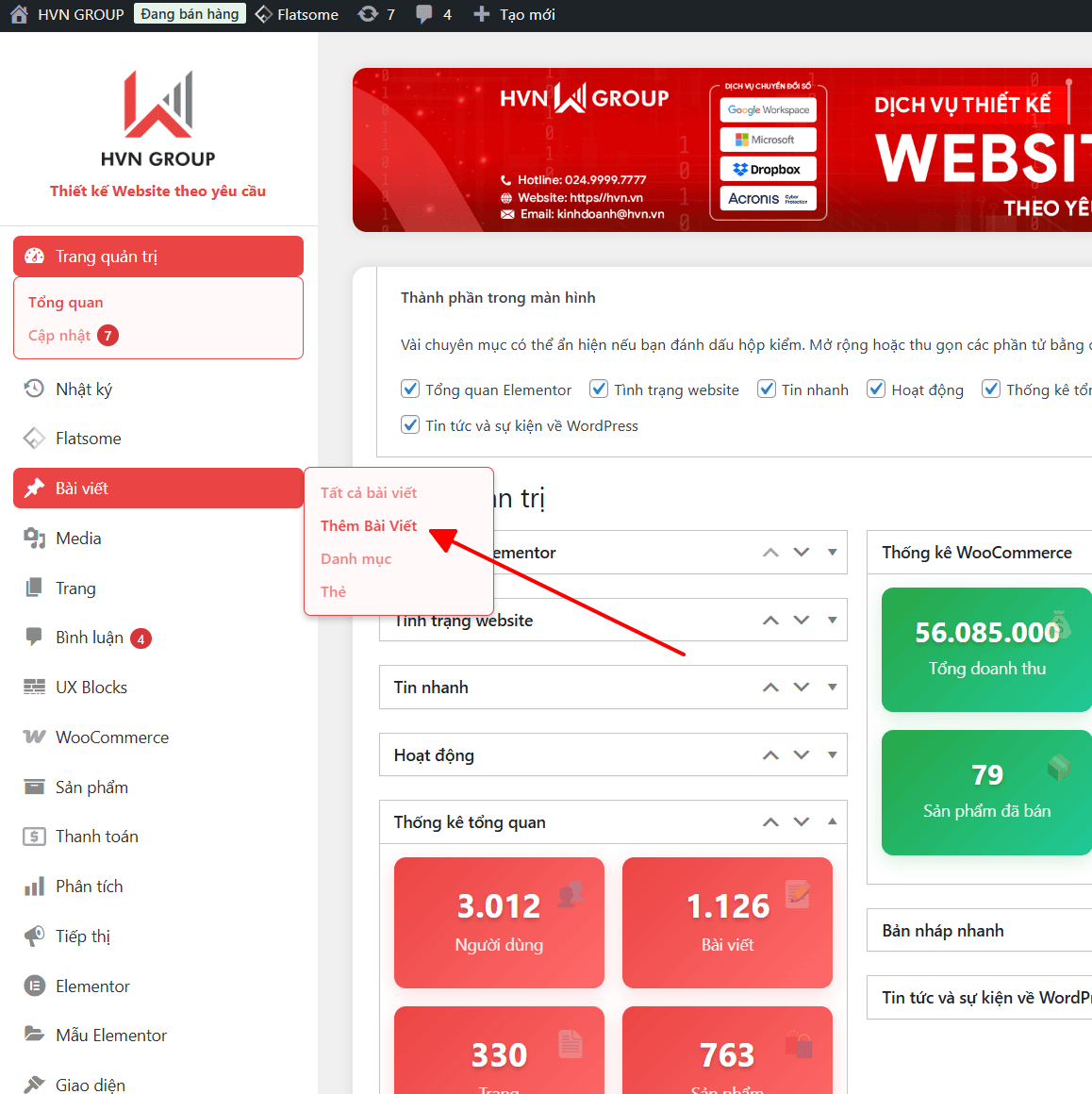 Trên thanh công cụ quản trị (dashboard) của WordPress ở bên trái màn hình, bạn tìm đến mục “Bài viết” (Posts) và nhấp vào tùy chọn “Viết bài mới” (Add new post).