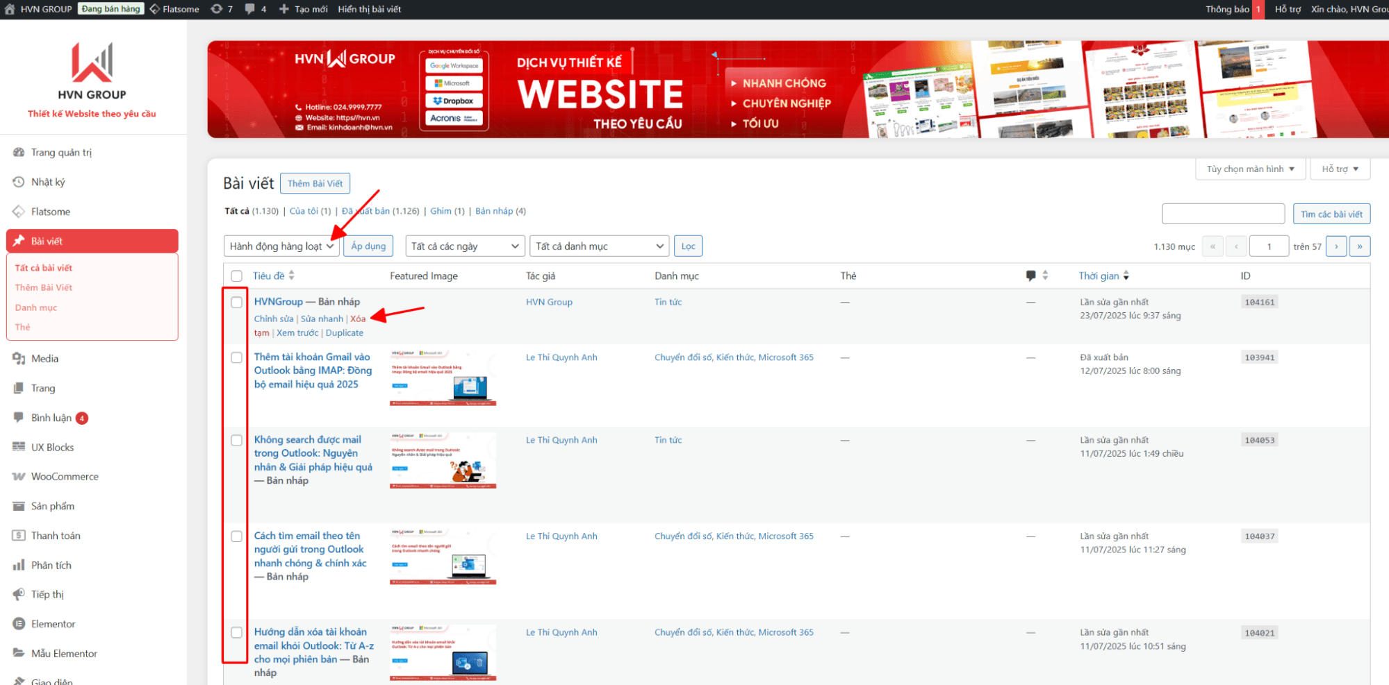- Tại danh sách bài viết, tích chọn vào các ô vuông bên cạnh tiêu đề những bài viết bạn muốn xóa.