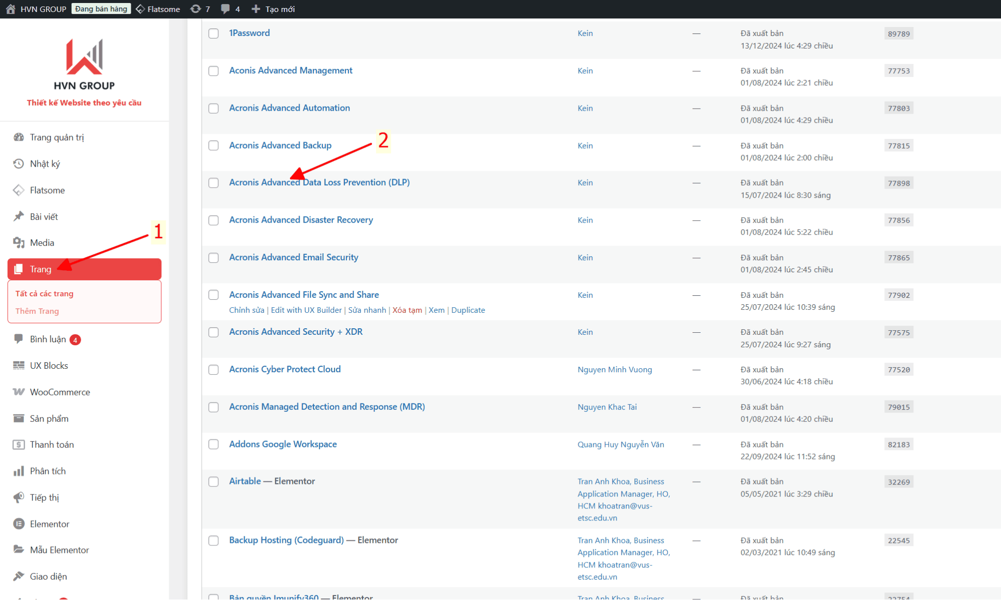 Rê chuột vào mục “Trang” chọn “Tất cả các trang” để xem các bải viết đã được đăng lên website và thao tác quản lý bài viết
