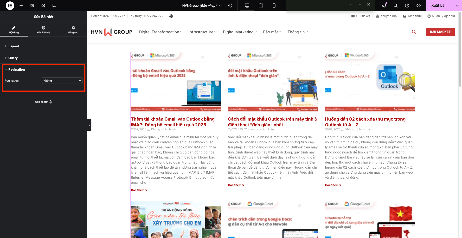 - Pagination (Phân trang): Chọn kiểu phân trang (ví dụ: Số trang, Tải thêm khi cuộn, Nút “Tải thêm”).