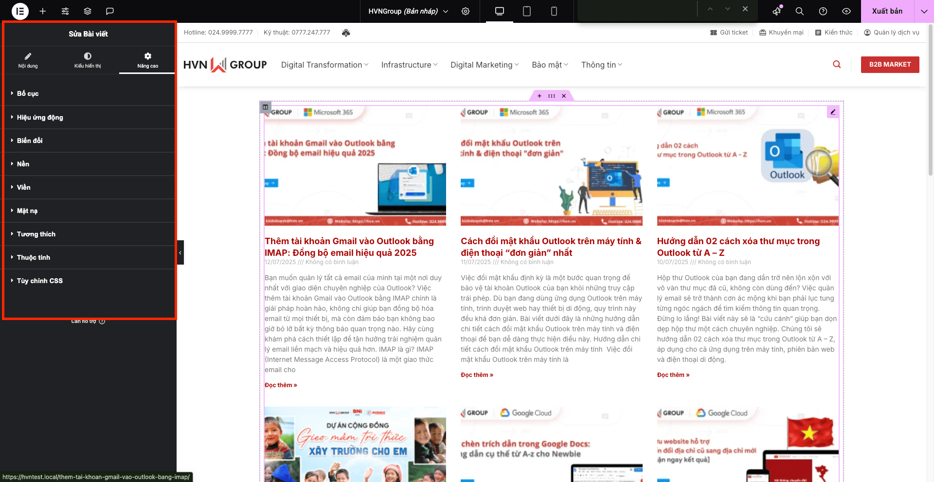 Tab này cung cấp các tùy chọn nâng cao hơn để kiểm soát bố cục, hiệu ứng và khả năng đáp ứng của toàn bộ tiện ích Bài viết.