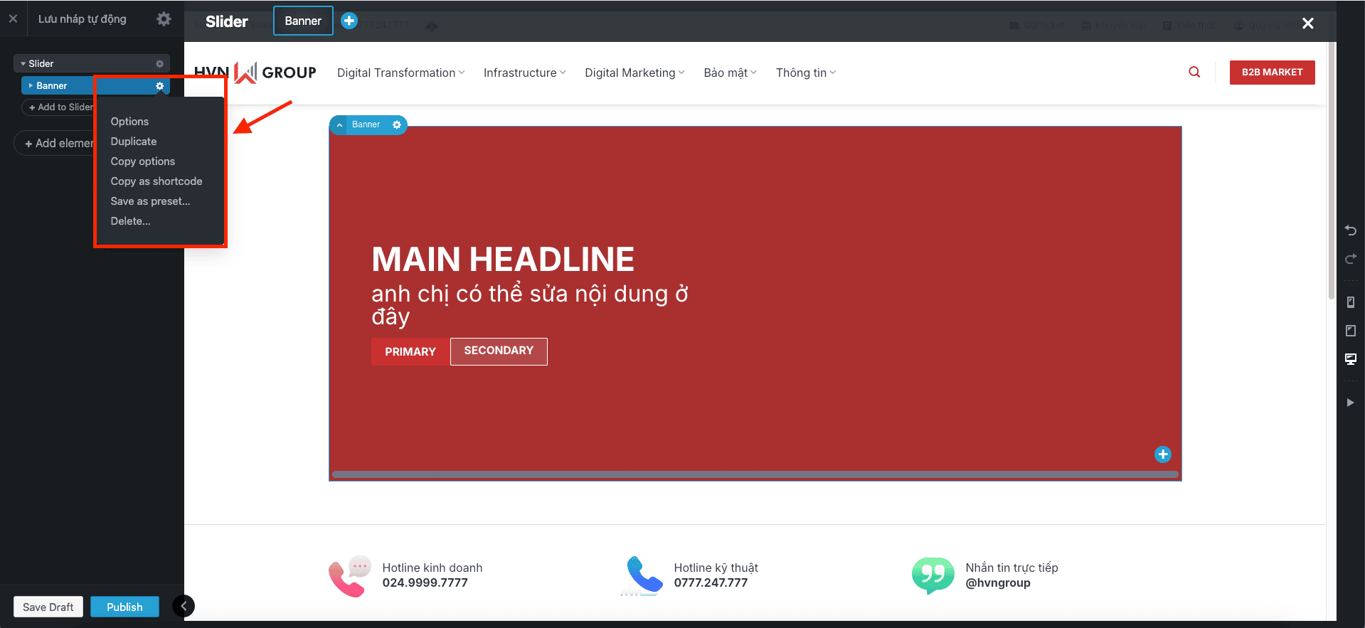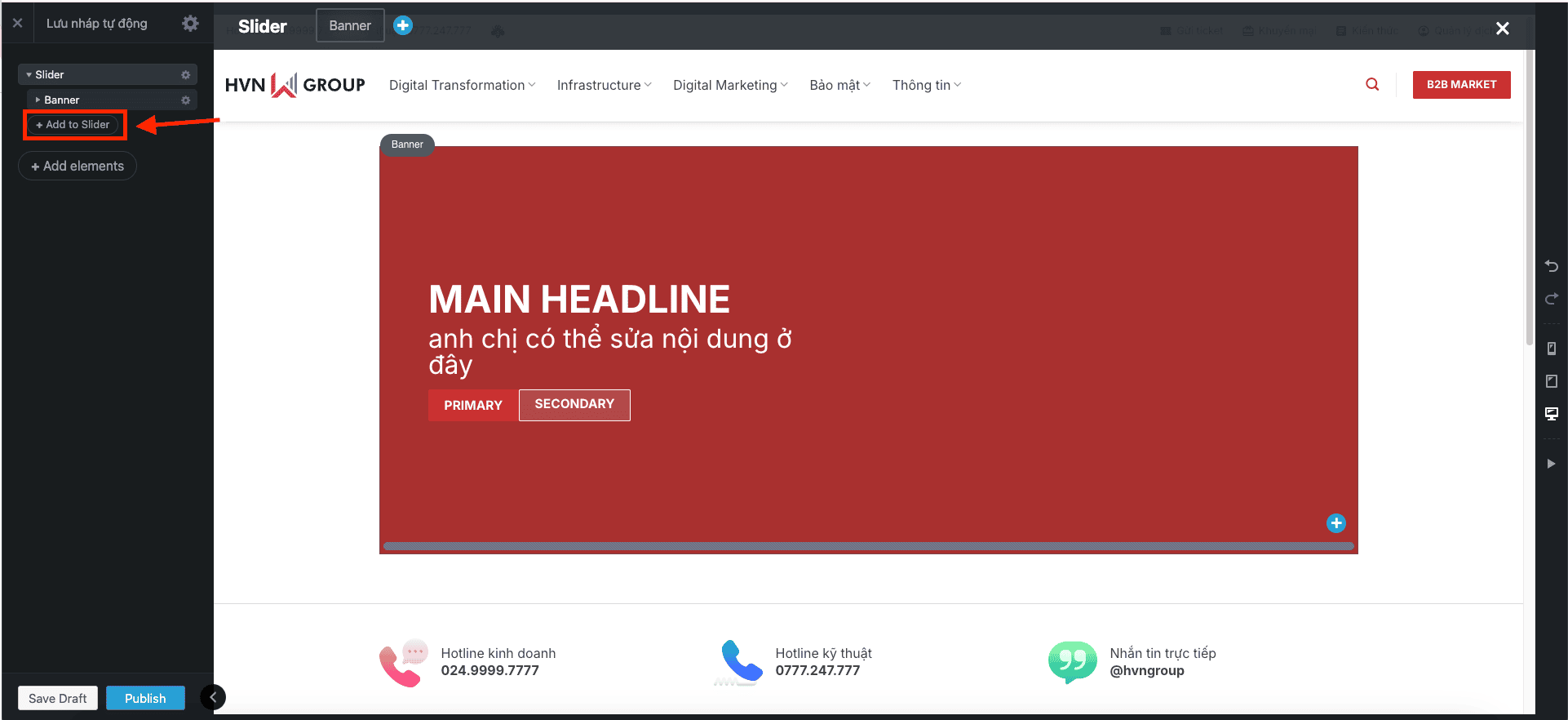 - Bắt đầu từ cái có sẵn: Cách dễ nhất là đừng thêm Slider mới, hãy chỉnh sửa ngay trên Slider đã được thiết kế sẵn trên trang của anh/chị. Cứ thay ảnh và sửa chữ là được.