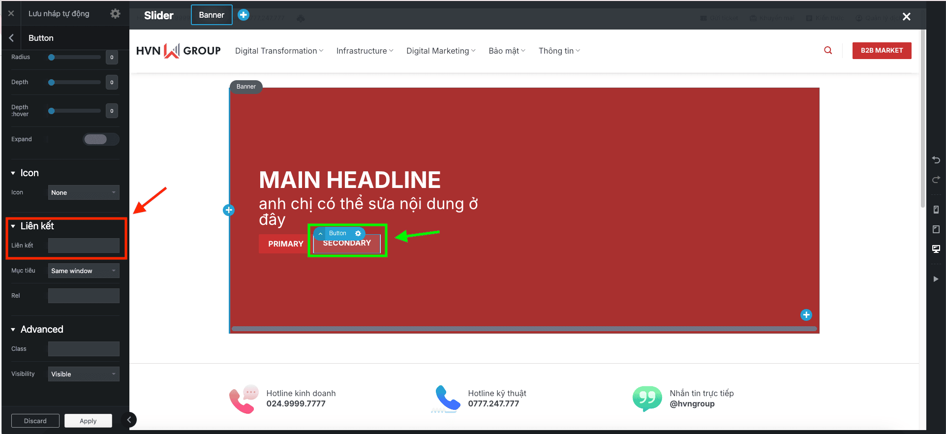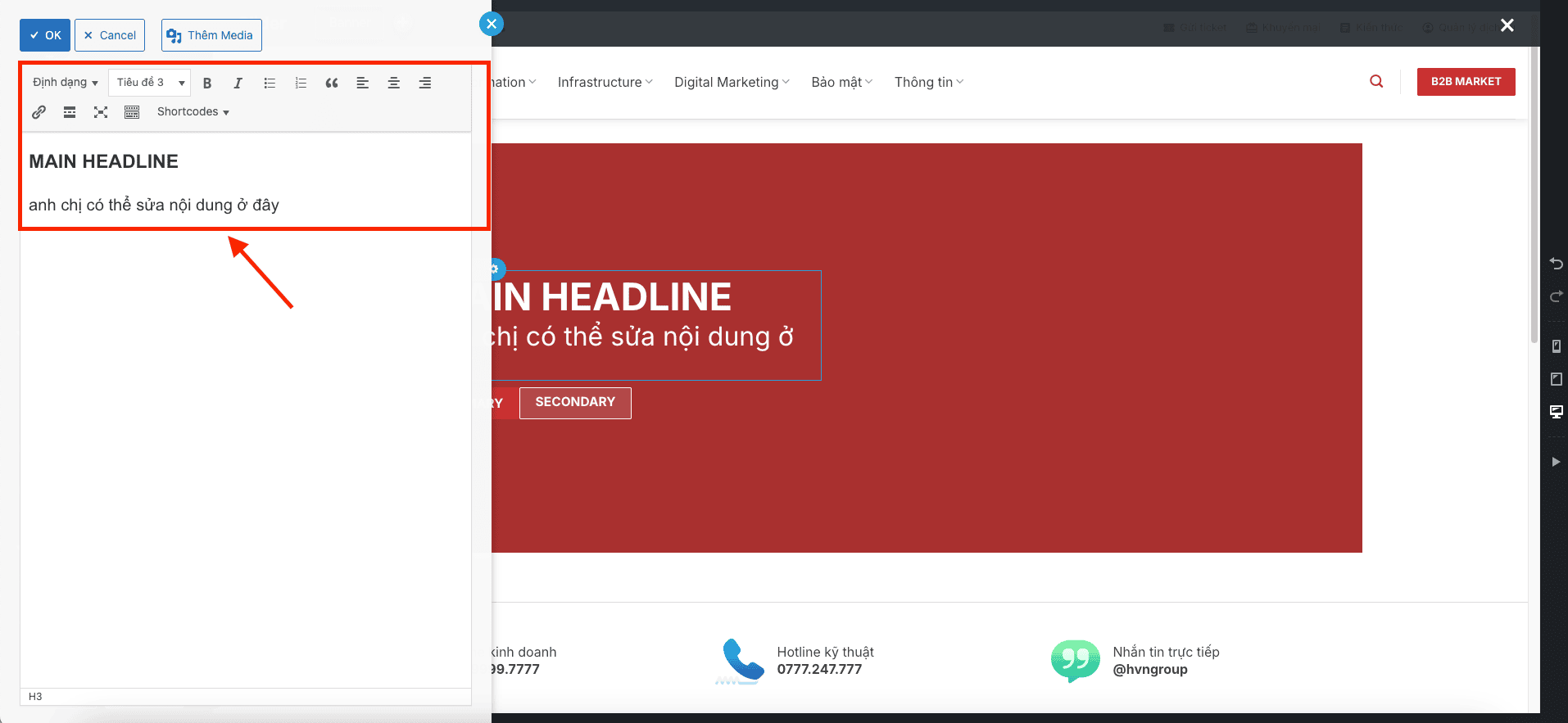 2. Cách sửa chữ và nút bấm (Textbox) trên Banner: