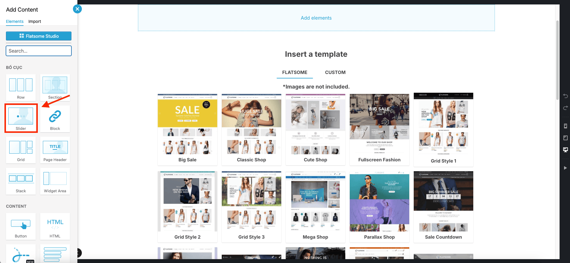 - Nhấn vào nút dấu cộng (+) ở vị trí anh/chị muốn đặt Slider.