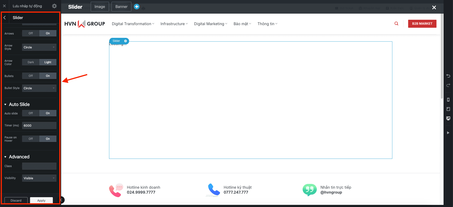 Anh/chị muốn Slider tự chạy hay không? Muốn có mũi tên hai bên hay dấu chấm tròn ở dưới?