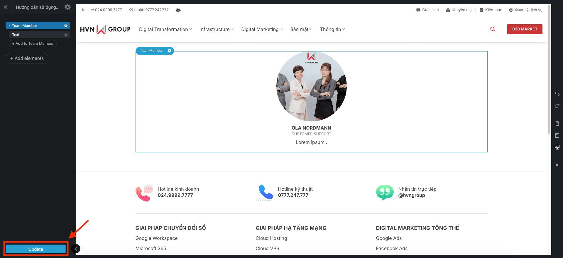 Bài viết này sẽ hướng dẫn Anh/Chị chi tiết từng bước để có thể tự tay thêm hoặc chỉnh sửa thông tin thành viên trong đội ngũ của mình trên trang web. Tính năng này rất hữu ích để giới thiệu đội ngũ nhân sự, chuyên gia, hoặc ban lãnh đạo công ty.