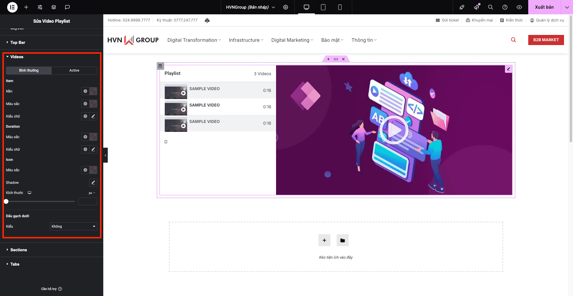 - Width (Chiều rộng): Đặt chiều rộng của toàn bộ tiện ích Video Playlist.