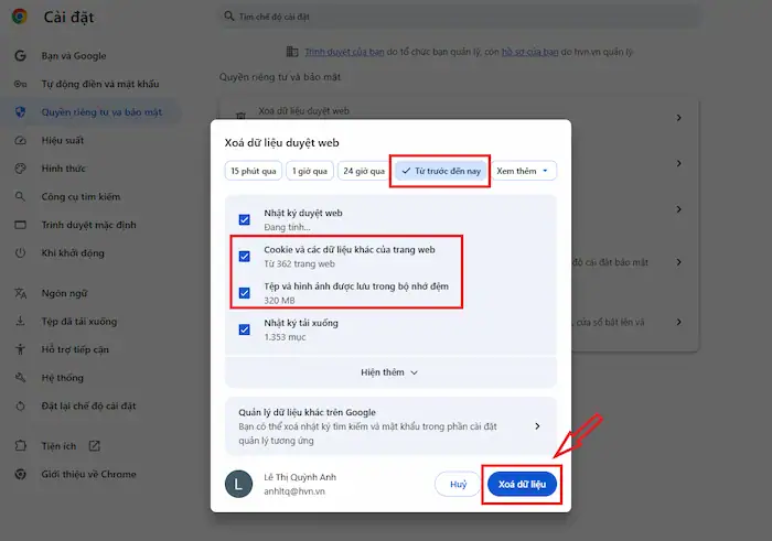 – Bước 4: Nhấn Xóa dữ liệu (Clear data) và khởi động lại trình duyệt để làm mới hệ thống.