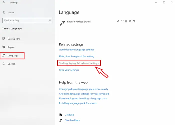 – Bước 2: Tùy chọn mục Time & Language >> Language >> tiếp tục di chuột xuống dưới, tìm và nhấn chọn mục Spelling, typing, & keyboard settings.