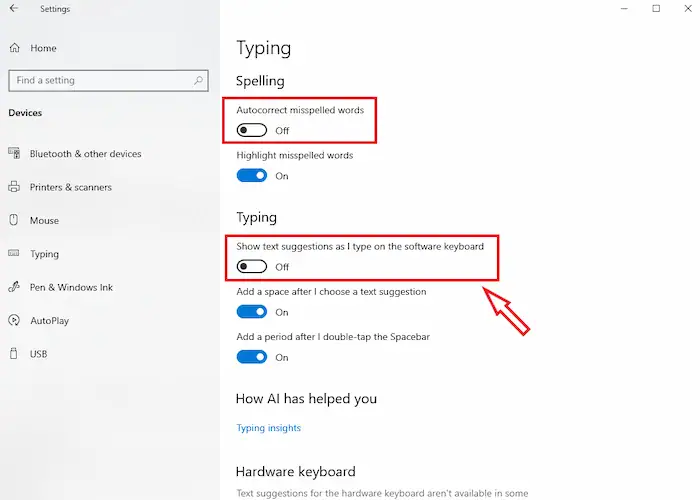 – Bước 3: Trong cửa sổ Typing, tìm mục Show text suggestions when typing on the physical keyboard >> gạt công tắc sang Off.