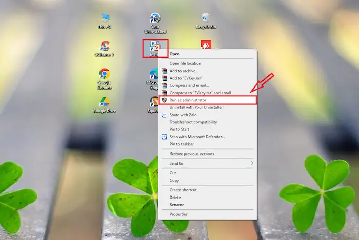 – Bước 2: Tìm biểu tượng Unikey/EVKey trên màn hình Desktop, click chuột phải và chọn Run as Administrator (Chạy với quyền quản trị).