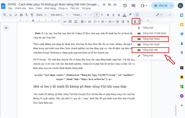 ![Cách khắc phục lỗi không gõ được tiếng Việt trên Google Docs [2026] 33 Một Số Lưu ý để Tránh Lỗi Không Gõ được Tiếng Việt Khi Soạn Thảo Trên Google Docs](https://hvn.vn/wp-content/uploads/2026/03/Mot-so-luu-y-de-tranh-loi-khong-go-duoc-tieng-Viet-khi-soan-thao-tren-Google-Docs.webp)