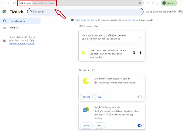 – Bước 2: Để xử lý, bạn nhập chrome://extensions/ vào thanh địa chỉ trình duyệt.