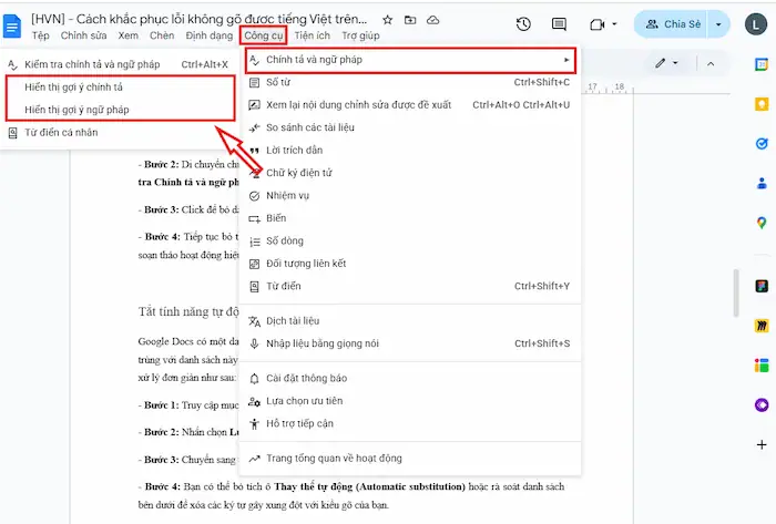 ![Cách khắc phục lỗi không gõ được tiếng Việt trên Google Docs [2026] 22 Tắt Tính Năng Kiểm Tra Chính Tả Trên Google Docs](https://hvn.vn/wp-content/uploads/2026/03/Tat-tinh-nang-kiem-tra-chinh-ta-tren-Google-Docs.webp)