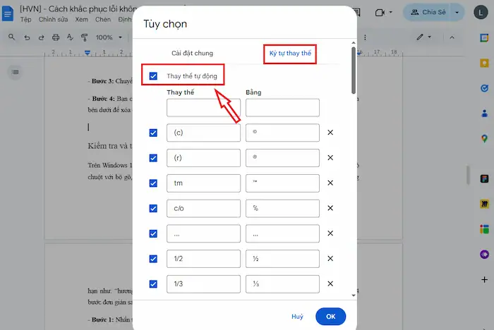 ![Cách khắc phục lỗi không gõ được tiếng Việt trên Google Docs [2026] 24 Tắt Tính Năng Tự động Thay Thế Văn Bản Trên Google Docs (1)](https://hvn.vn/wp-content/uploads/2026/03/Tat-tinh-nang-tu-dong-thay-the-van-ban-tren-Google-Docs-1.webp)