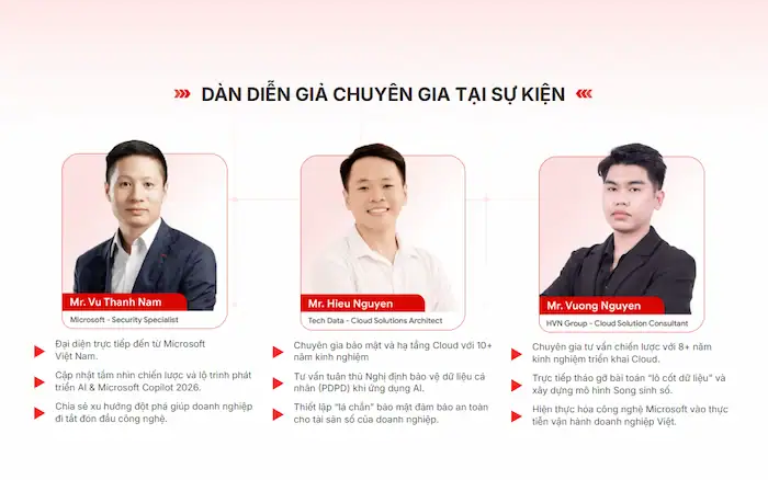 Với sự tham gia của đội ngũ chuyên gia từ chính Microsoft cùng các cộng sự dày dặn kinh nghiệm từ Tech Data và HVN Group hứa hẹn sẽ mang đến cái nhìn đa chiều và toàn diện nhất. Đây không chỉ là buổi hội thảo chia sẻ kiến thức, mà còn là “bàn làm việc chung” nơi các chuyên gia trực tiếp lắng nghe và tìm lời giải cho những bài toán vận hành cụ thể ngay tại doanh nghiệp của bạn.
