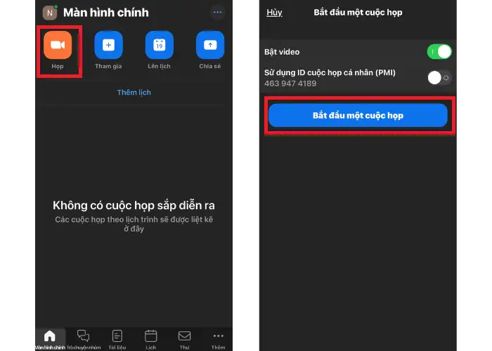 - Bước 1: Mở ứng dụng Zoom trên thiết bị điện thoại > click chọn Họp > tiếp đến chọn Bắt đầu một cuộc họp.
