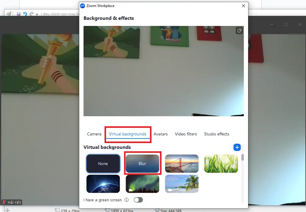 - Bước 2: Tiếp đến, giao diện điều chỉnh background và hình ảnh sẽ hiển thị. Tại đây, bạn click chọn Virtual backgrounds > tiếp đến chọn Blur.