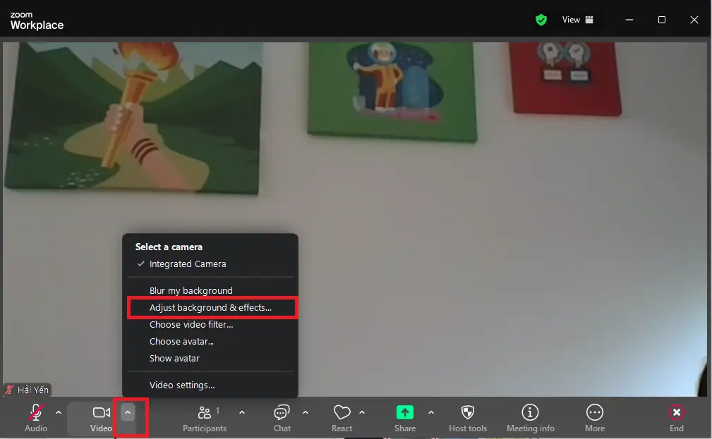 - Bước 1: Trong giao diện của cuộc họp trên Zoom click vào mũi tên chỉ lên bên cạnh biểu tượng Video > sau đó click chọn Adjust background & effects… hoặc có thể chọn luôn vào mục Blur my background.