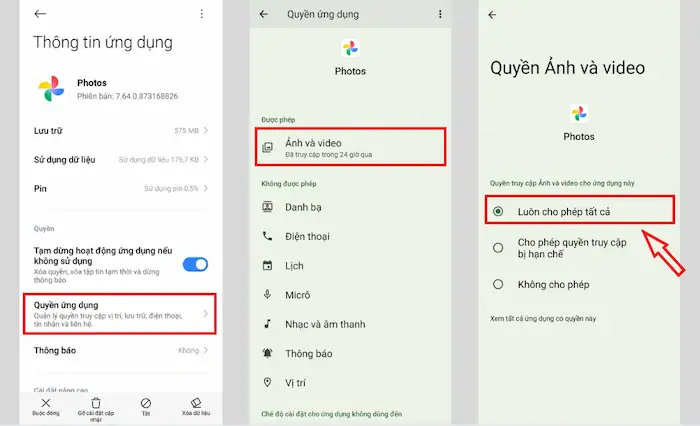 Khi cài đặt ứng dụng lần đầu, nhiều người vô tình nhấn “Từ chối” khi hệ thống hỏi quyền truy cập kho ảnh. Hoặc đôi khi sau một bản cập nhật phần mềm lớn, các quyền này bị đặt lại (reset). Nếu không có quyền truy cập, Google Photos sẽ không thể quét dữ liệu để hiển thị hoặc thực hiện sao lưu, dẫn đến việc ứng dụng bị treo ở màn hình khởi động hoặc báo lỗi thiếu bộ nhớ.
