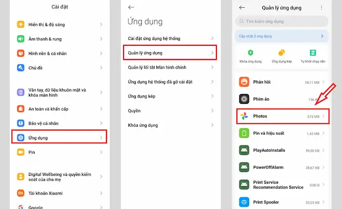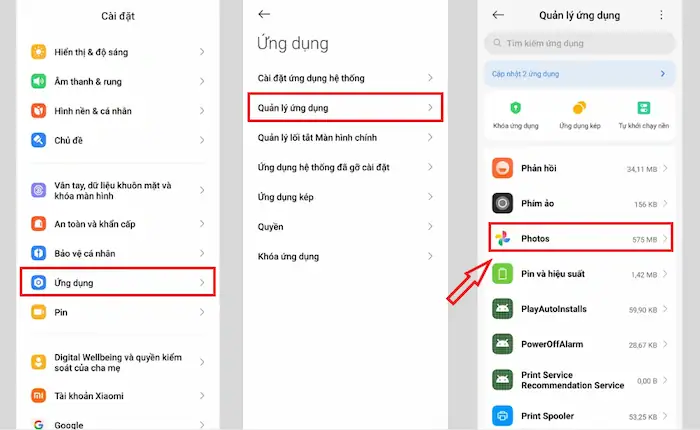 – Bước 1: Truy cập Cài đặt >> Ứng dụng >> Quản lý ứng dụng >> chọn Google Photos.