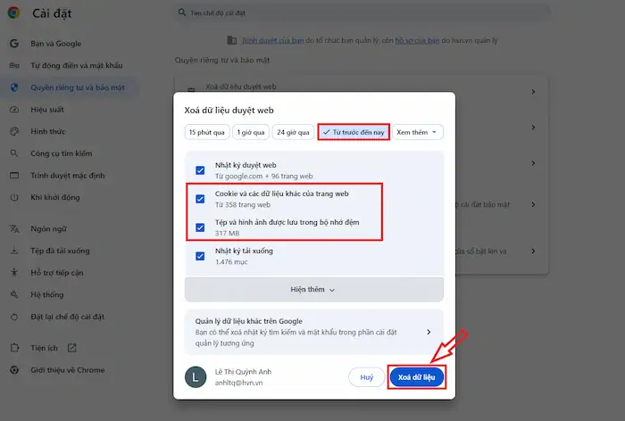 Xóa toàn bộ cookie và lịch sử đã lưu trên trình duyệt