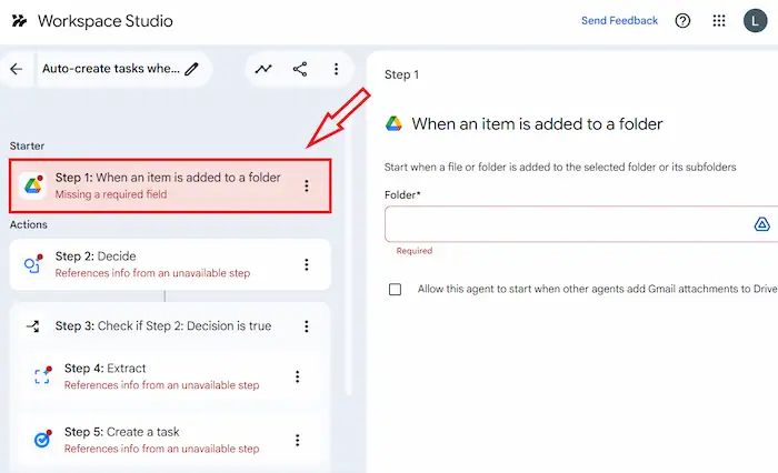 Bạn sẽ thấy một dấu chấm đỏ xuất hiện trên biểu tượng Google Workspace Flows trong Gmail, hoặc trên tab My agents và Activity trong ứng dụng web Flows. Bạn cần nhấp vào tác nhân đó và xem thông báo lỗi cụ thể trên bước gặp sự cố.