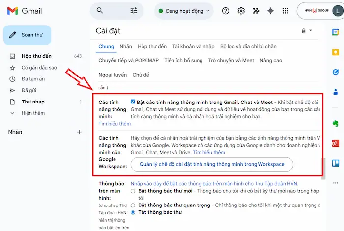 - Cách khắc phục: Truy cập Cài đặt Gmail (Settings), tìm đến mục Chung (General) >> tích chọn Bật các tính năng thông minh trong Gmail, Chat và Meet, đồng thời tùy chỉnh Quản lý chế độ cài đặt tính năng thông minh trong Workspace.