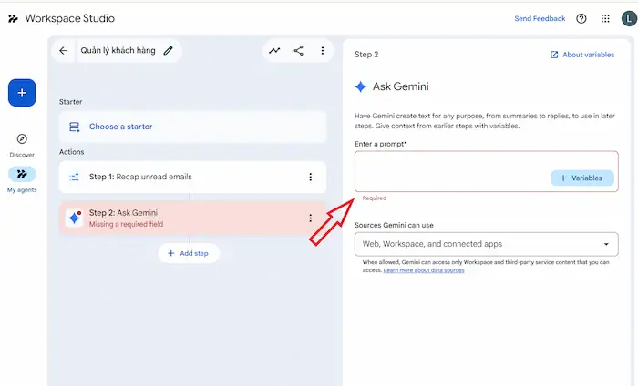 - Cách khắc phục: Thử tắt và bật lại tác nhân để hệ thống có thể nhắc bạn cấp lại quyền truy cập cần thiết. Nếu không được, bạn cần liên hệ với Quản trị viên Google Workspace để đảm bảo dịch vụ Flows được phép truy cập các ứng dụng liên quan.
