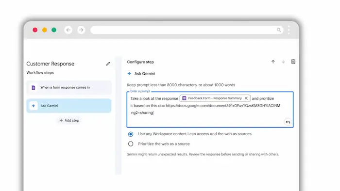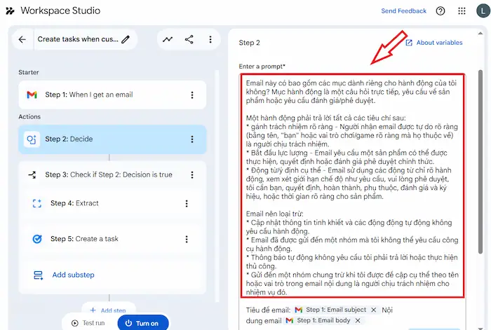 - Giới hạn Prompt: Nếu bạn sử dụng bước AI (Gemini) hoặc xử lý nội dung dài (ví dụ: email dài, nhiều tệp tham chiếu), hãy hạn chế biến và tránh đưa quá nhiều nội dung vào lời nhắc (prompt) để không vượt quá giới hạn ký tự của mô hình AI.