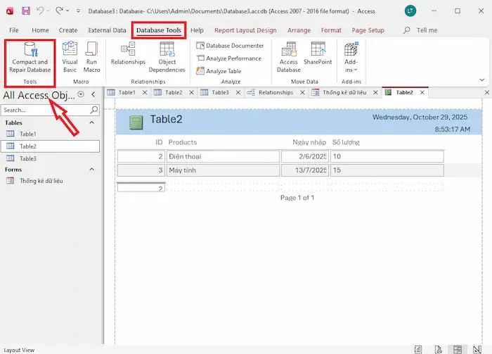 - Tối ưu hóa: Vào tab Database Tools >> sử dụng chức năng Compact and Repair Database để sửa chữa lỗi và tối ưu hóa hiệu suất file.