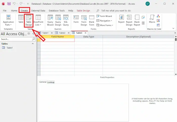 – Bước 3: Trong tab Create >> chọn Table Design.