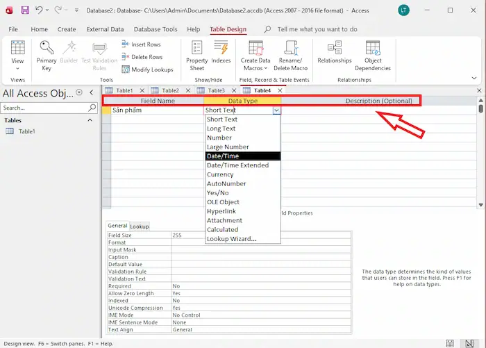 – Bước 4: Nhập tên các trường (Field Name) và chọn kiểu dữ liệu (Data Type) phù hợp như Text, Number, Date/Time…