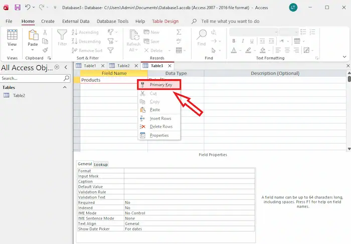 – Bước 5: Tuỳ chọn trường làm khóa chính bằng cách nhấn chuột phải >> nhấn Primary Key.