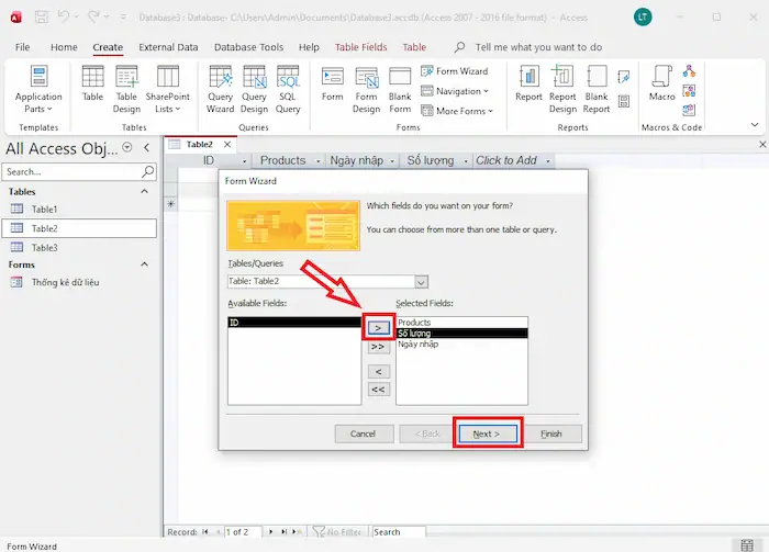 – Bước 3: Chọn các trường cần hiển thị bằng cách click biểu tượng “>”, sau đó nhấn Next.