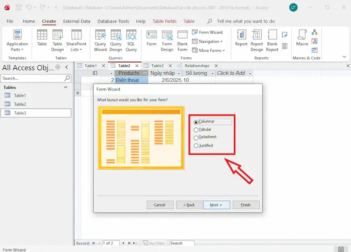 – Bước 4: Tùy chọn bố cục (Columnar, Tabular, Datasheet…) cho biểu mẫu.
