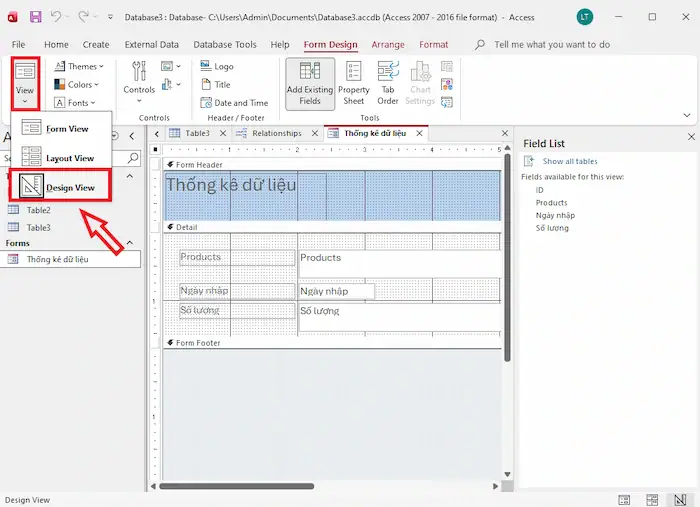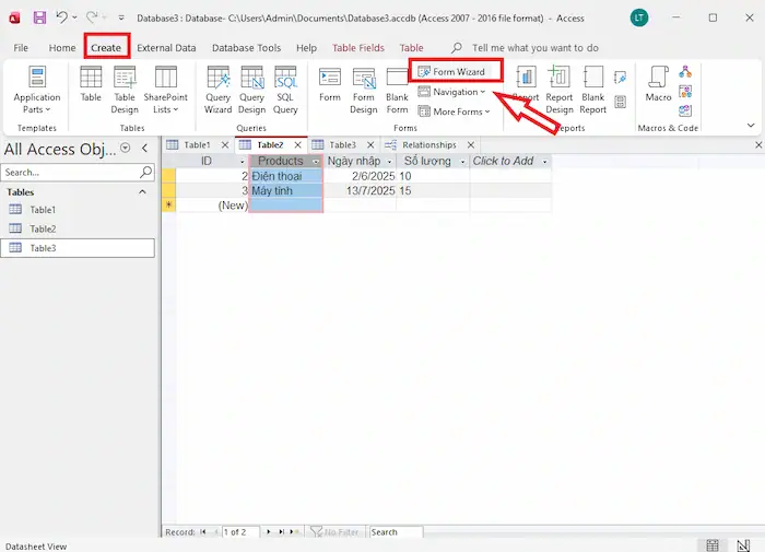 – Bước 4: Hãy đảm bảo mỗi bảng có một trường khóa chính (Primary Key) và các bảng liên quan có các trường khóa ngoại (Foreign Key) để liên kết. (Ví dụ: Products trong bảng Table2 là khóa chính, và Tailieu trong bảng Table1 là khóa ngoại).