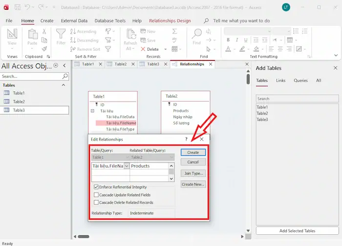 - Tích chọn Enforce Referential Integrity để đảm bảo dữ liệu liên kết chính xác.