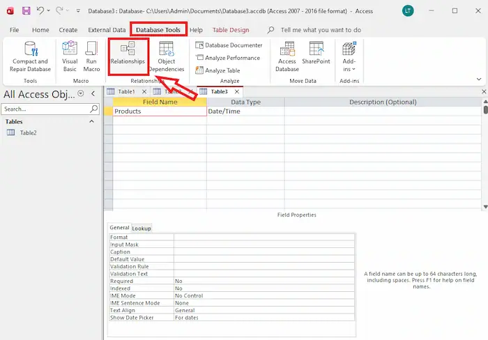 – Bước 1: Truy cập tab Database Tools >> chọn Relationships.
